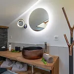Pełnowymiarowa kuchnia obejmuje lodówkę, płytę grzejną i szklane naczynia, a także urządzenie do parzenia kawy/herbaty dla wygody gości. Dostęp do centrum wellness przyczynia się do przyjemniejszego pobytu.